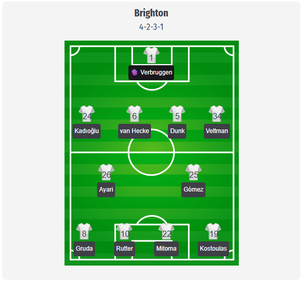 Η Μπράιτον αναμένεται να παραμείνει στο γνωστό 4-2-3-1, οπότε η προβλεπόμενη σύνθεσή μας περιλαμβάνει τον Verbruggen στο τέρμα, με πίσω του την τετράδα Kadıoğlu, van Hecke, Dunk και Veltman. Ο Ayari και ο Gómez θα μπορούσαν να σχηματίσουν και πάλι το δίδυμο των μέσων, ενώ ο Gruda και ο Mitoma θα πλαισιώνουν τον Rutter πίσω από τον Kostoulas στα πλάγια. Αυτή η δομή έχει υποστηρίξει τον υψηλό αριθμό σουτ της Μπράιτον υπό τον Hürzeler, ειδικά σε παιχνίδια εναντίον των μεγάλων ομάδων του πρωταθλήματος. Ο Webster, ο Minteh και ο Tzimas εξακολουθούν να απουσιάζουν, ενώ ο Baleba βρίσκεται στο AFCON και ο March και ο Wieffer έχουν πρόσφατα τραυματιστεί στο γόνατο και στα δάχτυλα των ποδιών αντίστοιχα. Αυτό περιορίζει τις επιλογές της Μπράιτον τόσο στα άκρα όσο και στο κεντρικό μέσο, οπότε ο Γκρούντα και ο Μιτόμα είναι και πάλι οι πιο πιθανότατοι βασικοί στα άκρα, με τους Γουέλμπεκ και Γκρος να είναι ισχυροί υποψήφιοι για να μπουν από τον πάγκο. Παραμένει μια προβλεπόμενη σύνθεση και όχι μια επιβεβαιωμένη αναγγελία της ομάδας.