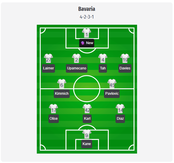 Υπό την καθοδήγηση του Kompany, η Μπάγερν αναμένεται να παρατάξει και πάλι το γνωστό 4-2-3-1, με τον Neuer στο τέρμα πίσω από τους Laimer, Upamecano, Tah και Davies. Ο Kimmich και ο Pavlovic θα πρέπει να παίξουν ως διπλό εξάρι μπροστά από την τετράδα της άμυνας, ενώ ο Olise, ο Karl και ο Diaz αναμένεται να υποστηρίξουν τον Kane, ο οποίος είναι σχεδόν βέβαιο ότι θα ξεκινήσει ως κεντρικός επιθετικός. Πρόκειται για μια προβλεπόμενη σύνθεση, με τον Boey να παραμένει εκτός λόγω ασθένειας και τον Musiala να απουσιάζει με σπασμένο κνήμιο. Ο Karl, που σκόραρε στη νίκη του Champions League εναντίον της Sporting, είναι μια επιλογή για τον κεντρικό ρόλο πίσω από τον Kane. Οι Upamecano και Tah θα παραμείνουν πιθανώς ως πρώτη επιλογή, ενώ οι Goretzka και Gnabry προσφέρουν διαφορετικά προφίλ από τον πάγκο, σε περίπτωση που ο Kompany κάνει προσαρμογές κατά τη διάρκεια του αγώνα.