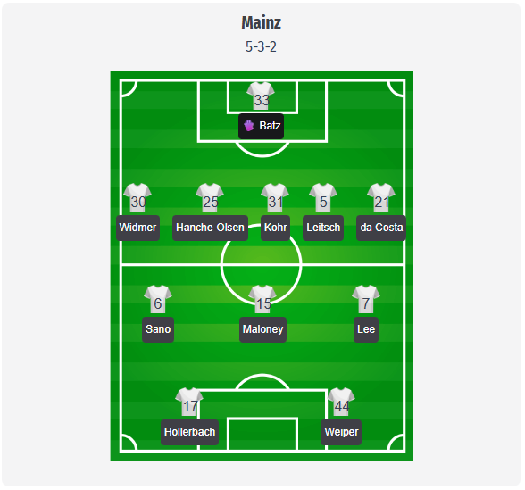 Αναμένεται ότι η Μάιντς θα παραμείνει στο 5-3-2 που επέλεξε ο Φίσερ για το συμπαγές ντεμπούτο του στο Πόζναν, με τον Μπατς να επιστρέφει στην εστία αντί του τραυματία Ζέντνερ. Μια τριάδα με τους Χάντσε-Όλσεν, Κορ και Λάιτς θα πλαισιώνεται από τους Βίντμερ και ντα Κόστα ως πλάγιοι αμυντικοί, υπό την προϋπόθεση ότι ο Βίντμερ θα έχει ξεπεράσει τον τραυματισμό του. Το επίκεντρο θα είναι και πάλι ένα συμπαγές, πειθαρχημένο μπλοκ και επιθετική πίεση στα πλάγια. Πιο μπροστά, το προβλεπόμενο τρίο της μεσαίας γραμμής θα είναι οι Sano, Maloney και Lee, οι οποίοι θα παίζουν σχετικά χαμηλά και θα προσπαθούν να αξιοποιήσουν τους Hollerbach και Weiper σε καταστάσεις αντεπίθεσης. Δεδομένου ότι οι Caci, Mwene και Dal εξακολουθούν να είναι εκτός και ο Amiri έχει μυϊκά προβλήματα, ο Fischer έχει περιορισμένες επιλογές για μεγάλες αλλαγές, οπότε ο Kawasaki παραμένει μάλλον η πιο σημαντική επιλογή από τον πάγκο παρά υποψήφιος για την αρχική ενδεκάδα.
