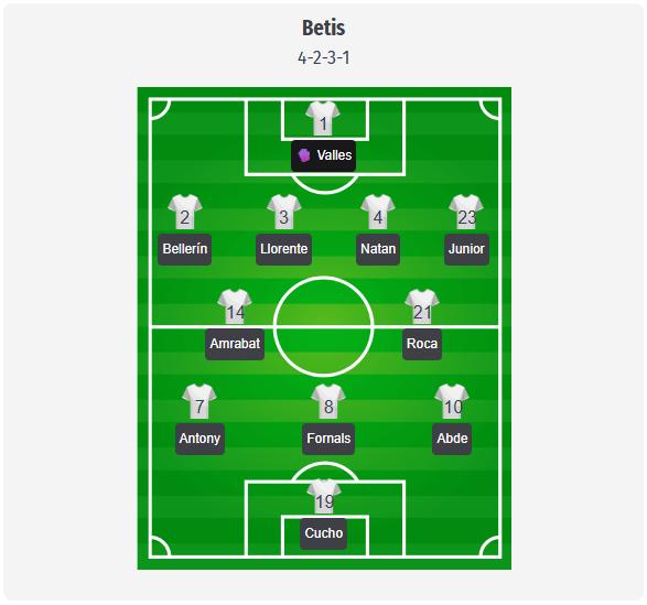 Ο προπονητής Manuel Pellegrini θα πρέπει να παραμείνει στο δοκιμασμένο 4-2-3-1, παρά τα προβλήματα με τις απουσίες. Σίγουρα θα λείψουν οι Bellerín, Lo Celso και Isco, με τον Bellerín να έχει το πιο σοβαρό μυϊκό τραυματισμό. Η μεγαλύτερη άγνωστη είναι ο Sofyan Amrabat, ο οποίος δεν μπόρεσε να προπονηθεί την Τρίτη. Αν δεν παίξει, θα πρέπει να αναδιοργανωθεί το αμυντικό κέντρο. Στην επίθεση, ο Cucho θα παίξει ως κεντρικός επιθετικός, ενώ οι Abde, Fornals και Antony θα αναλάβουν τους ρόλους των επιθετικών μέσων πίσω του. Αυτή η σύνθεση θα προσφέρει αρκετή ταχύτητα και επιθετική δύναμη, παρά τις απουσίες.