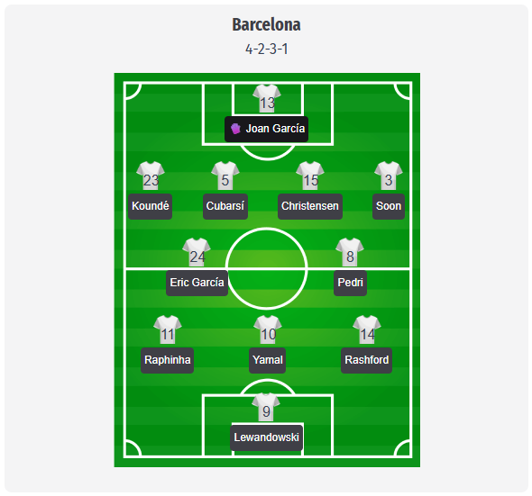 Ο προπονητής Χάνσι Φλικ αναμένεται να ξεκινήσει με σχηματισμό 4-2-3-1. Στην επίθεση αναμένεται να παίξουν οι Lamine Yamal, Raphinha και Rashford πίσω από τον κεντρικό επιθετικό Lewandowski. Στο κέντρο του γηπέδου η σύνθεση παραμένει αβέβαιη, ο Pedri επέστρεψε μετά τον τραυματισμό του στο μηρό και θα μπορούσε να ξεκινήσει αμέσως, ενώ δίπλα του ο Eric García θα αναλάβει τον αμυντικό ρόλο στο κέντρο, στον οποίο έπεισε πρόσφατα εναντίον της Ατλέτικο Μαδρίτης, όταν ο Frenkie de Jong έμεινε εκτός λόγω τραυματισμού. Συνολικά, η ομάδα έχει να αντιμετωπίσει αρκετές απουσίες. Ο Ronald Araújo θα λείψει για αόριστο χρονικό διάστημα για προσωπικούς λόγους, ο Frenkie de Jong παλεύει με μια λοίμωξη που συνοδεύεται από πυρετό, ο Dani Olmo θα λείψει για περίπου ένα μήνα μετά την εξάρθρωση του ώμου του στον αγώνα με την Atlético, ενώ οι Gavi και Fermín López θα λείψουν για μεγαλύτερο χρονικό διάστημα και δεν θα είναι στη διάθεση του Flick.