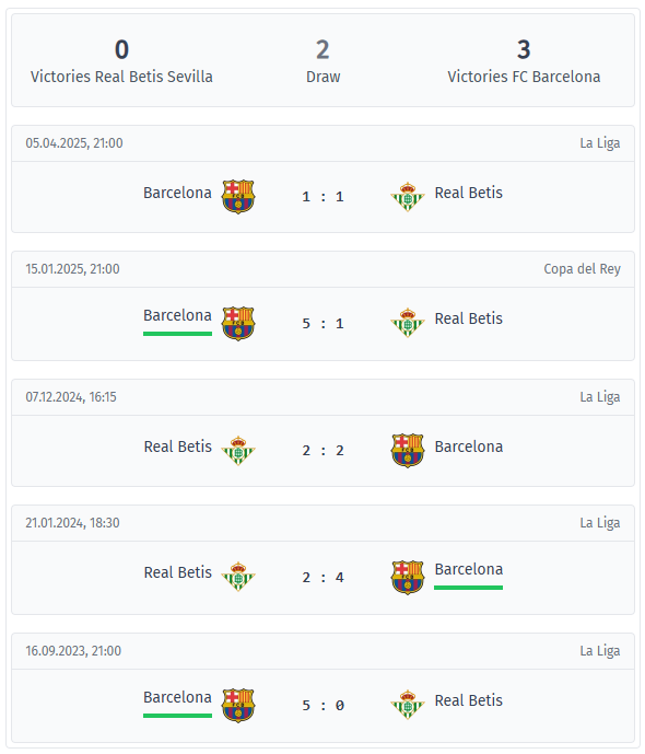 Ο απολογισμός των τελευταίων πέντε άμεσων αναμετρήσεων είναι απογοητευτικός για τη Ρεάλ Μπέτις, καθώς δεν έχει σημειώσει καμία νίκη, αλλά τρεις ήττες και δύο ισοπαλίες, κάτι που δείχνει την σαφή υπεροχή της Μπαρτσελόνα. Είναι αξιοσημείωτο ότι η Μπαρτσελόνα προηγούταν ήδη στο ημίχρονο και στις πέντε αναμετρήσεις, ενώ η Μπέτις δεν πήγε ποτέ στα αποδυτήρια με προβάδισμα, ένα μοτίβο που υποδηλώνει επαναλαμβανόμενα προβλήματα των Ανδαλουσιανών στην αρχική φάση του αγώνα. Τα αποτελέσματα σε λεπτομέρεια: Δεκέμβριος 2024 2:2, Απρίλιος 2025 1:1, Ιανουάριος 2025 στους προημιτελικούς του Copa 1:5, Ιανουάριος 2024 2:4, Σεπτέμβριος 2023 0:5 στο Camp Nou, τέσσερις από αυτές τις πέντε αναμετρήσεις έληξαν με περισσότερα από 3,5 γκολ και υπογραμμίζουν τον ανοιχτό, γρήγορο χαρακτήρα αυτής της αναμέτρησης. Η Μπαρτσελόνα σκόραρε τουλάχιστον ένα γκολ πριν το ημίχρονο και σε όλα τα πέντε παιχνίδια, ενώ η Μπέτις δέχτηκε γκολ σε όλα τα παιχνίδια, αλλά σκόραρε τουλάχιστον μία φορά σε τέσσερα από αυτά. Συνολικά, η Μπαρτσελόνα κυριάρχησε σαφώς στη σειρά, ειδικά στις αρχικές φάσεις, ενώ η Μπέτις πρέπει να γίνει πιο σταθερή στην αρχή του παιχνιδιού, για να αποφύγει τα γρήγορα γκολ και να πλησιάσει ξανά τα θετικά αποτελέσματα.