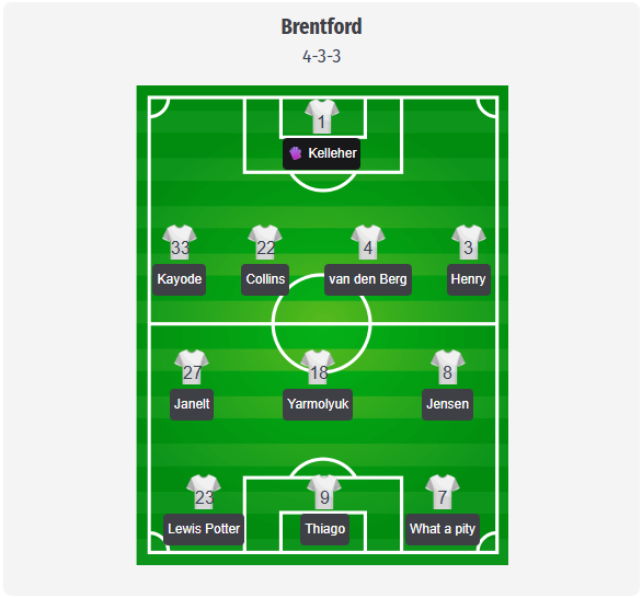 Η Μπρέντφορντ αναμένεται να παραμείνει στην οικεία διάταξη 4-3-3 από την προβλεπόμενη σύνθεσή μας, με τον Κέλεχερ στο τέρμα πίσω από μια τετράδα με τους Καγιόντε, Κόλινς, φαν ντεν Μπεργκ και Χένρι. Ο Janelt αναμένεται να καλύψει ξανά το κέντρο, πλαισιωμένος από τους Yarmolyuk και Jensen, ενώ οι Lewis-Potter και Schade θα υποστηρίξουν τον Thiago, ο οποίος έχει σκοράρει 11 γκολ στο πρωτάθλημα και έχει κινήσει το ενδιαφέρον της Λίβερπουλ. Πρόκειται για προβλεπόμενη αρχική ενδεκάδα, όχι για επιβεβαιωμένη. Τραυματισμοί και απουσίες επηρεάζουν αυτή την εκτίμηση, με τους Onyeka και Ouattara να συμμετέχουν στο AFCON, με αποτέλεσμα να λείπουν δύο αξιόπιστες επιλογές από το κέντρο και την επίθεση. Οι Dasilva, Milambo και Carvalho εξακολουθούν να είναι μακροχρόνιοι τραυματίες στο κέντρο μετά από προβλήματα στο γόνατο και τους χιαστούς συνδέσμους, με αποτέλεσμα το βάθος στο κέντρο να παραμένει περιορισμένο. Ο Nelson είναι και πάλι μια επιλογή και βρίσκεται στον προβλεπόμενο πάγκο μας, οπότε αυτός, ο Damsgaard ή ο Peart-Harris θα μπορούσαν να φέρουν τις πιο σημαντικές αλλαγές στην επίθεση.