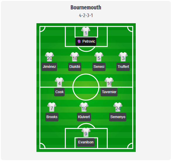 Η Μπόρνμουθ αναμένεται να παραμείνει στο συνηθισμένο 4-2-3-1 του Iraola, οπότε η προβλεπόμενη σύνθεσή μου αντικατοπτρίζει αυτή που χρησιμοποιήθηκε εναντίον της Μπέρνλι, με τον Petrovic στο τέρμα πίσω από μια τετράδα με τους Jiménez, Diakité, Senesi και Truffert. Ο Cook και ο Tavernier θα πρέπει να σταθεροποιήσουν το κέντρο, ενώ ο Brooks και ο Kluivert θα παίζουν στα πλάγια και ο Semenyo θα υποστηρίζει τον κεντρικό επιθετικό Evanilson, διατηρώντας έτσι το υψηλό πρέσινγκ και τις γρήγορες μεταβάσεις που συνδέονται με αυτή την ομάδα. Ο Άνταμς εξακολουθεί να είναι εκτός λόγω ρήξης του εσωτερικού συνδέσμου και ο Γκάνον-Ντοακ δεν είναι ακόμη διαθέσιμος λόγω τραυματισμού στο μηρό, οπότε ο Ιραόλα θα πρέπει να βασιστεί και πάλι στον ίδιο πυρήνα. Η ενδεκάδα που αναφέρεται πρέπει να θεωρηθεί πιθανή και όχι επιβεβαιωμένη, ενώ οι Σκοτ, Κρίστι, Άντλι και Κρούπι προσφέρουν εναλλακτικές λύσεις για να αλλάξουν τη δομή του κέντρου ή να φέρουν φρέσκια δύναμη στην επίθεση.
