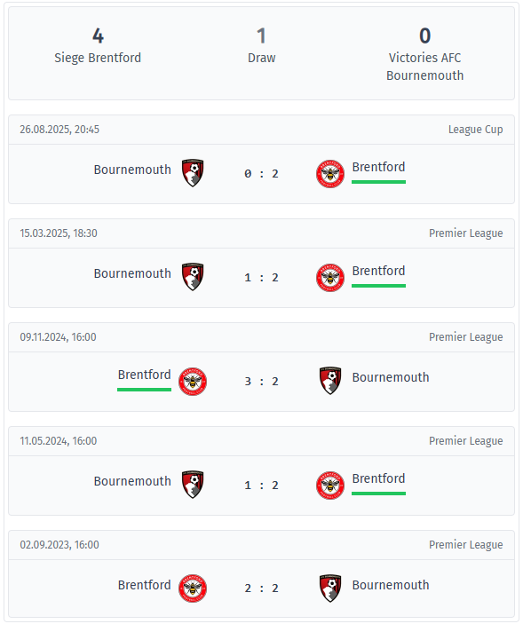 Στις τελευταίες πέντε αναμετρήσεις, η Brentford ήταν σαφώς ανώτερη, με τέσσερις νίκες και μία ισοπαλία, ενώ η Bournemouth εξακολουθεί να περιμένει μια επιτυχία. Το συνολικό αποτέλεσμα είναι 11-6 υπέρ της Brentford, κάτι που υπογραμμίζει όχι μόνο τον έλεγχο των αποτελεσμάτων της, αλλά και την ικανότητά της να υπερισχύει σταθερά της Bournemouth τόσο στο πρωτάθλημα όσο και στο κύπελλο. Η πιο πρόσφατη σειρά ξεκίνησε με 2-2 το 2023, μετά την οποία η Brentford ανέλαβε πλήρως τα ηνία, το 2024 κέρδισε με 2-1 εκτός έδρας και με 3-2 εντός έδρας, πριν προσθέσει άλλη μια νίκη με 2-1 στο Μπόρνμουθ τον Μάρτιο του 2025 και κερδίσει με 2-0 στον Λιγκ Καπ τον Αύγουστο του 2025, ολοκληρώνοντας μια σειρά τεσσάρων νικών. Τα γκολ ήταν ένα σταθερό θέμα, κάθε παιχνίδι αυτής της σειράς είχε τουλάχιστον δύο γκολ, και σε τέσσερα από τα πέντε τελείωσε με τρία ή περισσότερα, η Μπρέντφορντ σκόραρε και στα πέντε παιχνίδια, η Μπόρνμουθ σε τέσσερα, ωστόσο υπήρξε μόνο ένα παιχνίδι της Μπρέντφορντ χωρίς να δεχτεί γκολ, κάτι που δείχνει ότι η Μπόρνμουθ παραμένει επικίνδυνη ακόμα και όταν χάνει. Το μοτίβο μέσα στα παιχνίδια είναι επίσης αποκαλυπτικό, τέσσερα από τα πέντε παιχνίδια ήταν ισορροπημένα στο ημίχρονο και τα τελευταία τέσσερα έληξαν όλα με ισοπαλία στο ημίχρονο. Η Μπρέντφορντ ανέλαβε στη συνέχεια τον έλεγχο, κερδίζοντας το δεύτερο ημίχρονο σε τέσσερα παιχνίδια, ενώ η Μπόρνμουθ τιμωρήθηκε επανειλημμένα μόλις άνοιξε το παιχνίδι. Για το επερχόμενο ντέρμπι της λίγκας, η πρόσφατη ιστορία υποδηλώνει λοιπόν ένα ματς που θα ξεκινήσει μάλλον προσεκτικά και θα μπορούσε να κλίνει υπέρ της Μπρέντφορντ καθώς οι δυνάμεις θα εξασθενίζουν. Είναι πιθανό η Μπόρνμουθ να προσπαθήσει να σπάσει αυτόν τον κύκλο, παίζοντας πιο επιθετικά από νωρίς, καθώς μόλις το παιχνίδι ανοίξει, αυτά τα πέντε παιχνίδια δείχνουν ότι η Μπρέντφορντ διαχειρίζεται καλύτερα τις κρίσιμες στιγμές.
