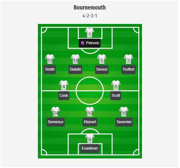 Το συνηθισμένο 4-2-3-1 του Iraola αναμένεται να διατηρηθεί, με τον Petrovic στο τέρμα και μια τετράδα αμυντικών με τους Smith, Diakité, Senesi και Truffert. Ο Cook και ο Scott θα πρέπει να σχηματίσουν το διπλό εξάρι, εξασφαλίζοντας ισορροπία μπροστά από μια άμυνα που, μετά τις αλλαγές στην αρχή της σεζόν, έχει δείξει μεγαλύτερη σταθερότητα τελευταία, αν και δεν αποκλείονται εναλλαγές στο πυκνό πρόγραμμα του Δεκεμβρίου.