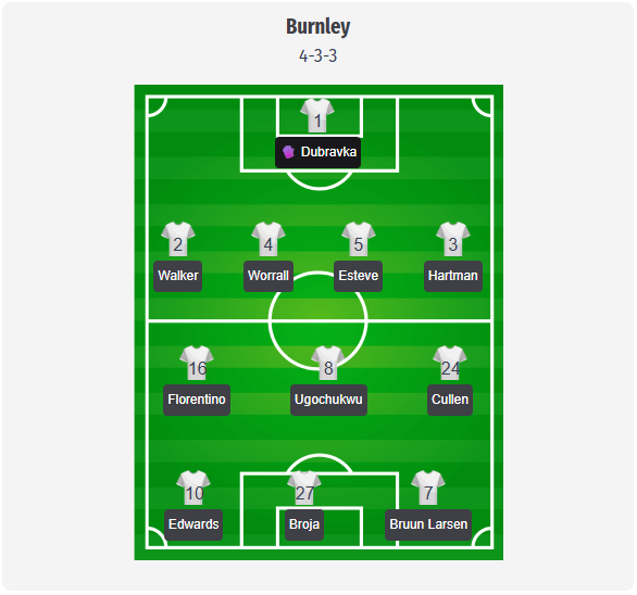 Αναμένεται ότι η Μπέρνλι υπό τον Σκοτ Πάρκερ θα παραμείνει στο συνηθισμένο σύστημα 4-3-3. Η προβλεπόμενη σύνθεσή μας περιλαμβάνει τον Ντουμπράβκα στο τέρμα, με πίσω του μια τετράδα με τους Γουόκερ, Γουόρραλ, Εστέβε και Χάρτμαν. Στο κέντρο, οι Florentino και Ugochukwu θα παίζουν λίγο πιο πίσω, ενώ ο Cullen θα συνδέει τους τρεις μπροστινούς Edwards, Broja και Bruun Larsen, αν και αυτό είναι σαφώς μια πρόβλεψη και όχι μια επιβεβαιωμένη αρχική ενδεκάδα.