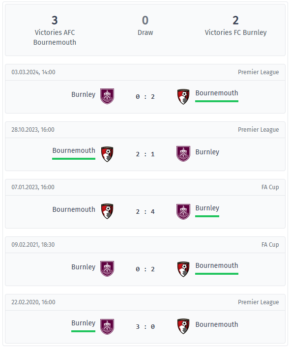 Στις τελευταίες πέντε αναμετρήσεις από το 2020, η Μπόρνμουθ έχει το προβάδισμα με τρεις νίκες, η Μπέρνλι κέρδισε δύο από αυτά τα παιχνίδια και δεν υπήρξε ούτε μία ισοπαλία. Ο συνολικός αριθμός των γκολ είναι ισορροπημένος με οκτώ γκολ ανά πλευρά, κάτι που αρχικά υποδηλώνει μια σφιχτή αναμέτρηση, ειδικά καθώς η φιλοξενούμενη ομάδα κέρδισε σε τρεις από αυτές τις πέντε αναμετρήσεις και το πλεονέκτημα της έδρας δεν ήταν ένας αξιόπιστος δείκτης.