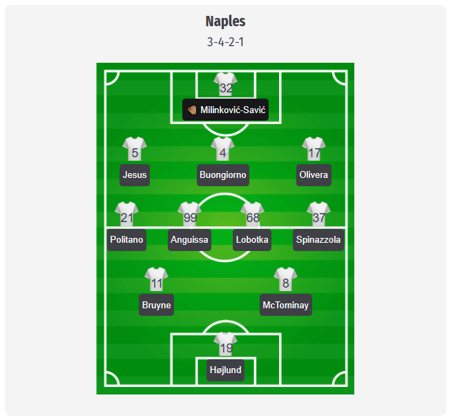 Η Νάπολι αναμένεται να διατηρήσει σε μεγάλο βαθμό το συνηθισμένο 3-4-2-1 του Αντόνιο Κόντε, αν και φυσικά αυτό αποτελεί απλώς μια πρόβλεψη. Στην αμυντική γραμμή, οι Χουάν Χεσούς (5), Αλεσάντρο Μπουοντζόρνο (4) και Ματίας Ολιβέρα (17) ενδέχεται να αγωνιστούν μπροστά από τον Βάνια Μιλίνκοβιτς-Σάβιτς (32). Δεδομένου ότι ο Αμίρ Ραχμάνι και ο Τζιοβάνι Ντι Λορέντζο είναι και οι δύο εκτός, αυτό αναμένεται να αλλάξει αισθητά την αμυντική ισορροπία και ειδικά τη δεξιά πτέρυγα.
