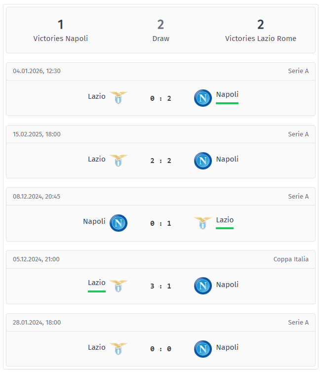 Η Νάπολι κέρδισε την πιο πρόσφατη αναμέτρηση τον Ιανουάριο του 2026 με 2-0, αλλά η ευρύτερη εικόνα παρουσιάζει μια πιο ισορροπημένη εικόνα. Η Λάτσιο κέρδισε δύο από τις τέσσερις προηγούμενες αναμετρήσεις, συμπεριλαμβανομένου του αγώνα πρωταθλήματος του 2024 και της αναμέτρησης για το Coppa Italia αργότερα εκείνο το έτος, ενώ οι άλλες δύο έληξαν ισόπαλες. Ίσως πιο αποκαλυπτικό είναι αυτό που συμβαίνει στο δεύτερο ημίχρονο: σε τέσσερις από τις πέντε τελευταίες αναμετρήσεις, τα γκολ παρέμειναν κάτω από 1,5, και στα τρία τελευταία παιχνίδια αυτό ίσχυσε χωρίς εξαίρεση.