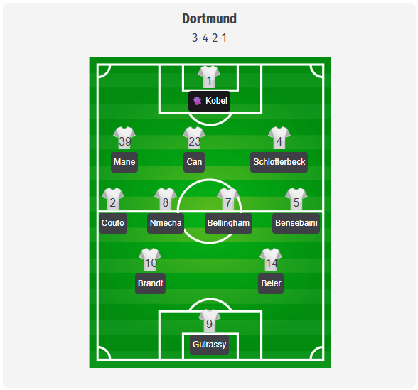 Ο Kovac αναμένεται να αφήσει το Ντόρτμουντ να παίξει με 3 4 2 1, με τον Kobel πίσω από μια τριάδα αμυντικών που αποτελείται από τους Mane, Can και Schlotterbeck. Οι Couto και Bensebaini θα πρέπει να δώσουν πλάτος ως wingbacks, ενώ οι Nmecha και Bellingham θα καθορίσουν το ρυθμό στο κέντρο. Στα ημιπεδία, ο Brandt και ο Beier θα είναι το δημιουργικό δίδυμο που θα τροφοδοτεί τον Guirassy, ως σημείο αναφοράς για τελειωτικές προσπάθειες και για να κρατήσει την μπάλα. Το μεγαλύτερο πρόβλημα βρίσκεται στον κεντρικό άξονα: ο Anton και ο Süle είναι τραυματίες, ο Sabitzer επίσης δεν θα παίξει, οπότε η εναλλαγή είναι πιο περιορισμένη από το συνηθισμένο, ειδικά αφού ο Anselmino κλήθηκε πίσω και δεν είναι πλέον διαθέσιμος. Ο Ryerson ή ο Svensson θα μπορούσαν να παίξουν, αν η Ντόρτμουντ προτιμήσει έναν πιο προσεκτικό wingback, ενώ ο Özcan ή ο Chukwuemeka είναι οι προφανείς εναλλακτικές λύσεις στο κέντρο. Ο Adeyemi παραμένει πιθανή αλλαγή για να φέρει νέα δυναμική.