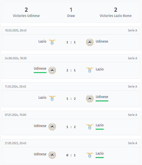 Στις τελευταίες πέντε αναμετρήσεις της Serie A από το 2023, το ισοζύγιο είναι αξιοσημείωτα ισορροπημένο, με δύο νίκες για κάθε ομάδα και μία ισοπαλία. Η Λάτσιο κέρδισε τις δύο πρώτες αναμετρήσεις, το 2023 και το 2024 στην Ούντινε. Η Ουντινέζε κέρδισε στη συνέχεια τα δύο επόμενα παιχνίδια το 2024, πριν το 1-1 στη Ρώμη τον Μάρτιο του 2025. Κάθε παιχνίδι αποφασίστηκε με ένα μόνο γκολ ή έληξε ισόπαλο. Ένα σαφές μοτίβο στενών αποτελεσμάτων εμφανίζεται και στα στατιστικά. Και οι πέντε αγώνες έληξαν με λιγότερα από 3,5 γκολ, αλλά τέσσερις από αυτούς είχαν τουλάχιστον δύο. Συνολικά, κάθε ομάδα έχει σκοράρει έξι γκολ και έχει δεχτεί έξι σε αυτό το διάστημα, με την διαφορά τερμάτων να είναι εντελώς ισορροπημένη. Μόνο μία φορά μια ομάδα έμεινε χωρίς γκολ, η Ουντινέζε στην ήττα με 0-1 το 2023, κάτι που υπογραμμίζει επιπλέον την ισορροπία. Το ίδιο ισχύει και για την πορεία του αγώνα. Σε τέσσερις από τις πέντε αναμετρήσεις, το πρώτο ημίχρονο έμεινε κάτω από 1,5 γκολ, και μόνο μετά άνοιξε το παιχνίδι στο δεύτερο ημίχρονο. Η Λάτσιο σκόραρε και στις πέντε αναμετρήσεις και πέτυχε γκολ μετά το ημίχρονο σε τέσσερα συνεχόμενα παιχνίδια. Η Ουντινέζε δέχτηκε ένα γκολ σε κάθε αναμέτρηση και στα ίδια τέσσερα παιχνίδια δέχτηκε επίσης ένα γκολ στο δεύτερο ημίχρονο. Τα αποτελέσματα ανά τόπο διεξαγωγής προσθέτουν μια επιπλέον πτυχή. Η Λάτσιο κέρδισε δύο από τα τρία εκτός έδρας παιχνίδια στην Ούντινε κατά τη διάρκεια αυτής της περιόδου, ενώ η Ουντινέζε πήρε τέσσερις βαθμούς από τα δύο τελευταία ταξίδια της στη Ρώμη. Και οι δύο ομάδες θα αντιμετωπίσουν την επόμενη αναμέτρηση με σεβασμό σε αυτή την πρόσφατη ισορροπία και θα περιμένουν ένα άλλο συμπαγές ντέρμπι, στο οποίο ένα μόνο γκολ θα μπορούσε να είναι καθοριστικό.