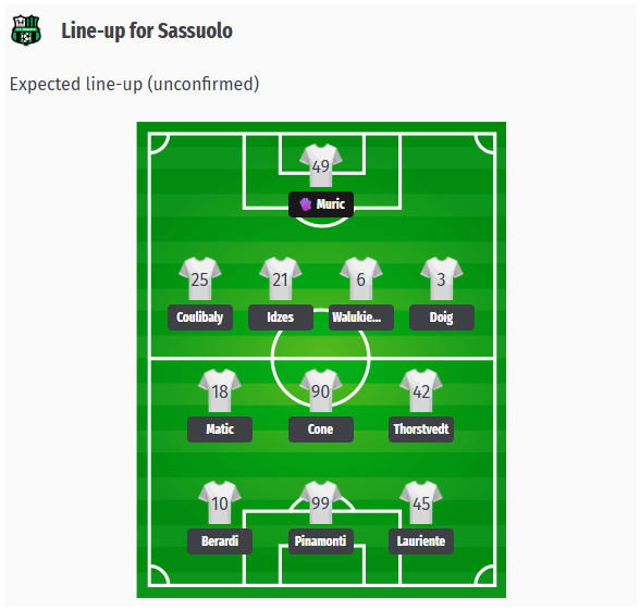 Σχετικά με την προβλεπόμενη σύνθεση της Σασσουόλο, σε αυτή την ενότητα δεν υπάρχει ακόμη συγκεκριμένος κείμενο για τη διάταξη με τους παίκτες, αλλά μόνο μια γενική ένδειξη για το πώς θα μπορούσε να επεξεργαστεί ένα τέτοιο κείμενο.