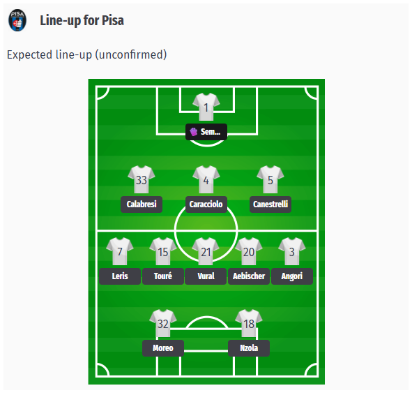 Η Πίζα αναμένεται να αγωνιστεί με το συνηθισμένο 3-5-2, με τον Semper στο τέρμα και την τριάδα Calabresi, Caracciolo και Canestrelli μπροστά. Στο κεντρικό μέσο αναμένεται το δίδυμο Vural και Aebischer, στα πλάγια θα είναι οι Touré και Léris για πλάτος και τρέξιμο κατά μήκος της γραμμής.