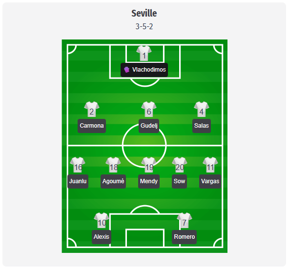Ο Almeyda θα διατηρήσει πιθανότατα το 3-5-2 τη Δευτέρα κόντρα στην Celta, με τον Vlachodimos να είναι και πάλι ο φαβορί για τη θέση του τερματοφύλακα. Στην τριάδα της άμυνας αναμένεται να παίξουν οι Carmona, Gudelj και Salas, ενώ οι Juanlu και Vargas θα αναλάβουν να καλύψουν τα πλάγια. Στο κέντρο, οι Agoumé, Mendy και Sow θα καθορίζουν το ρυθμό και θα εξασφαλίζουν τις μεταβάσεις, ενώ μπροστά ο Alexis θα παίζει πίσω από τον Romero. Ωστόσο, αυτό είναι μόνο μια πρόβλεψη και επηρεάζεται σε μεγάλο βαθμό από τις απουσίες. Ο Marcão είναι τιμωρημένος, οι Azpilicueta, Suazo και Alfon εξακολουθούν να είναι τραυματίες, ενώ οι Ejuke και Adams βρίσκονται με τη Νιγηρία. Αν ο Vargas δεν είναι έτοιμος μετά από λίγες μόνο προπονήσεις, ο Januzaj θα μπορούσε να μπει στην αρχική ενδεκάδα. Οι Cardoso, Nianzou και Jordán φαίνονται ως οι πιο σημαντικές επιλογές για αλλαγές στο παιχνίδι.