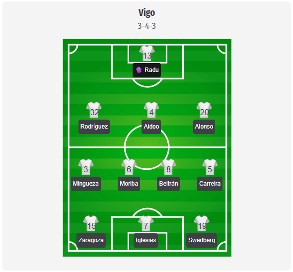 Ο Giráldez θα διατηρήσει πιθανότατα το γνωστό 3-4-3, με τον Radu πίσω από την τριάδα Rodríguez, Aidoo και Alonso. Οι Mingueza και Carreira θα φροντίσουν για το πλάτος, ενώ και οι δύο μπορούν να μετακινηθούν στο κέντρο, ώστε η Celta να καταφέρει να χτίσει το παιχνίδι της μέσω των Moriba και Beltrán. Στην επίθεση, οι Σαραγόσα και Σβέντμπεργκ φαίνονται ως οι πιο πιθανές απειλές από τα πλάγια, με τον Ιγκλέσιας ως κεντρικό σημείο αναφοράς. Ωστόσο, αυτό είναι μόνο μια πρόβλεψη, και το σημαντικότερο πρόβλημα παραμένει η έλλειψη παικτών στην αριστερή πλευρά, με τους Ντομίνγκεζ και Ρίστικ να συνεχίζουν να απουσιάζουν και τον Σοτέλο να μην είναι επίσης διαθέσιμος. Αυτό θα μπορούσε να κάνει το προπονητικό επιτελείο να είναι προσεκτικό με τις αλλαγές και να επιλέξει τον Σταρφελτ ή τον Λάγκο ως πρώτη επιλογή, σε περίπτωση που χρειαστεί να αναδιαμορφωθεί η τελευταία γραμμή. Ο Άσπας, αν και πάλι μείνει στον πάγκο, παραμένει η προφανής επιλογή για την τελική φάση.