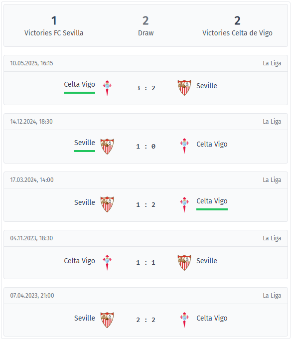 Στις τελευταίες πέντε αναμετρήσεις, η Σέλτα έχει το προβάδισμα με 2 νίκες έναντι 1 της Σεβίλλης, καθώς και 2 ισοπαλίες. Η πιο πρόσφατη αναμέτρηση τον Μάιο του 2025 έληξε με 3-2 υπέρ της Σέλτα, σε ένα παιχνίδι που κέρδισε περισσότερο από μικρές στιγμές παρά από σαφή έλεγχο. Η μόνη νίκη της Σεβίλλης σε αυτή τη σειρά χρονολογείται από το 2024, με ένα στενό 1-0, που ανέτρεψε την συνήθη ροή των γκολ σε αυτό το ντέρμπι. Σε τέσσερα από αυτά τα πέντε παιχνίδια, και οι δύο ομάδες σκόραραν, με μόνη εξαίρεση το 1-0 της Σεβίλλης το 2024. Η Σεβίλλη σκόραρε και στα πέντε παιχνίδια, μια αξιόπιστη σταθερά, ακόμα και αν τα αποτελέσματα ήταν ασταθή. Από την άλλη πλευρά, η Σέλτα δέχτηκε γκολ και στα πέντε παιχνίδια, αλλά κέρδισε δύο φορές. Είναι φανερό ότι οι καλύτερες φάσεις της σε αυτά τα ντέρμπι προήλθαν από την υπεροχή της στην επίθεση και όχι από την άμυνα. Είναι ενδιαφέρον ότι οι αρχικές φάσεις ήταν συχνά δύσκολες, με λιγότερα από 1,5 γκολ στο πρώτο ημίχρονο σε τέσσερα συνεχόμενα ντέρμπι. Μετά το διάλειμμα, όμως, σπάνια καταλήγουν σε καθαρή αναμέτρηση, καθώς σε αυτό το δείγμα δεν υπήρξε ισοπαλία στο δεύτερο ημίχρονο. Η Σεβίλλη έχει δεχτεί γκολ σε τρεις συνεχόμενους αγώνες εναντίον της Celta, ενώ η Celta έχει σκοράρει τρεις φορές στη σειρά. Αυτό υποδηλώνει ότι σε αυτή την αναμέτρηση η υπομονή και η καθαρή εκτέλεση μετράνε στο τέλος του παιχνιδιού.
