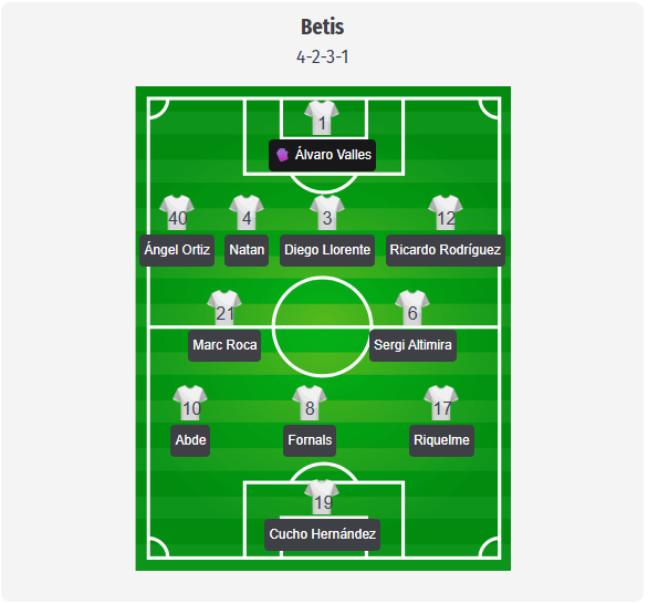 Ο Manuel Pellegrini αναμένεται να παραμείνει στο συνηθισμένο 4-2-3-1, παρόλο που λείπουν αρκετοί βασικοί παίκτες. Οι Isco, Lo Celso και Amrabat είναι τραυματίες, ο Antony εκτίει ποινή και ο Bellerín συνεχίζει να έχει προβλήματα με τον soleus μυ. Στην πιθανή αρχική ενδεκάδα, ο Cucho Hernández αναμένεται να ξεκινήσει ως κεντρικός επιθετικός, με πίσω του μια επιθετική τριάδα με τους Abde, Fornals και Riquelme. Στο αμυντικό κέντρο, οι Marc Roca και Sergi Altimira θα σχηματίσουν πιθανώς το δίδυμο μπροστά από την άμυνα, ενώ η τετράδα της άμυνας θα αποτελείται από τους Natan, Llorente και Ricardo Rodríguez, καθώς και τον νεαρό Ángel Ortiz στη δεξιά πλευρά.