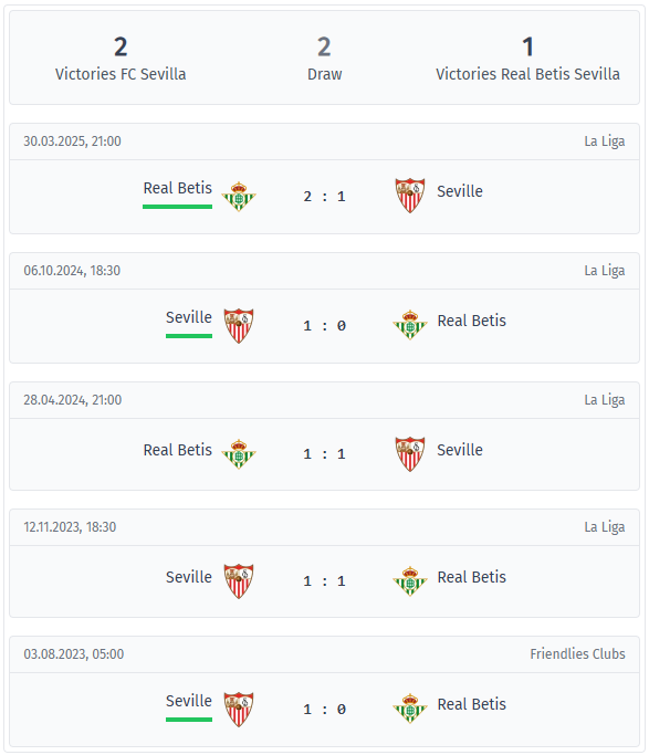 Στις τελευταίες πέντε αναμετρήσεις μεταξύ των δύο ομάδων, η Σεβίλλη κέρδισε δύο φορές, η Ρεάλ Μπέτις κέρδισε ένα ντέρμπι και δύο αγώνες έληξαν ισόπαλοι. Και στις πέντε αναμετρήσεις η Σεβίλλη σκόραρε τουλάχιστον ένα γκολ, ενώ η Μπέτις δέχτηκε τουλάχιστον ένα γκολ σε κάθε αγώνα. Το τελευταίο ντέρμπι τον Μάρτιο του 2025 κέρδισε η Μπέτις εκτός έδρας με 2-1, ενώ προηγουμένως η Σεβίλλη είχε επικρατήσει τον Οκτώβριο του 2024 με 1-0. Οι αγώνες τον Απρίλιο του 2024 και του 2023 έληξαν με 1-1. Τέσσερα από αυτά τα πέντε παιχνίδια έμειναν κάτω από 2,5 γκολ, και τα πέντε κάτω από 3,5 γκολ, οπότε συνολικά ήταν ντέρμπι με λίγα γκολ. Αξιοσημείωτη είναι επίσης η κατανομή των γκολ, καθώς τα περισσότερα γκολ σημειώνονται μετά το ημίχρονο. Η Σεβίλλη σκόραρε σε τέσσερις από τις πέντε αναμετρήσεις στο δεύτερο ημίχρονο, ενώ η Μπέτις φαίνεται ευάλωτη αμυντικά ακριβώς σε αυτή τη φάση. Συνολικά, τα στατιστικά δείχνουν τακτικά, μάλλον φτωχά σε ευκαιρίες ντέρμπι, στα οποία η Σεβίλλη είναι σταθερά παρούσα στην επίθεση και η Μπέτις κλονίζεται κυρίως μετά την αλλαγή πλευρών.