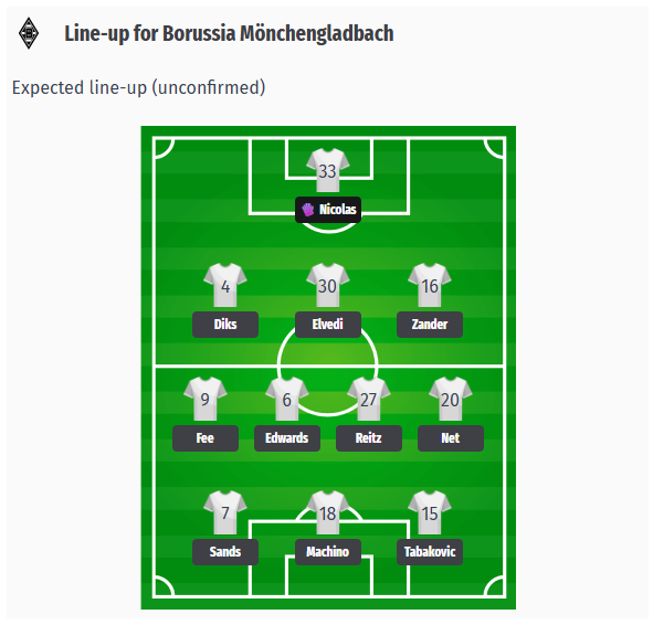 Ο προπονητής Eugen Polanski προφανώς σχεδιάζει μια τριάδα με τον Nicolas στο τέρμα. Οι Diks, Elvedi και Sander θα σχηματίσουν την άμυνα, ενώ οι Engelhardt και Reitz θα λειτουργήσουν ως κεντρικοί αμυντικοί μέσοι. Οι Honorat και Netz θα καλύψουν τις πτέρυγες, ενώ ο Stöger θα παίξει πίσω από το επιθετικό δίδυμο Machino και Tabakovic.