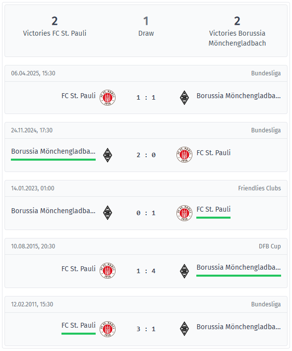 Ο απολογισμός των τελευταίων πέντε συναντήσεων είναι ισορροπημένος: δύο νίκες για το St. Pauli και δύο για τη Gladbach, καθώς και μία ισοπαλία. Το πιο πρόσφατο αποτέλεσμα τον Απρίλιο έληξε 1-1 στο Millerntor, όταν το St. Pauli ισοφάρισε. Τον Νοέμβριο του 2024, η Gladbach κέρδισε εκτός έδρας με 2-0.