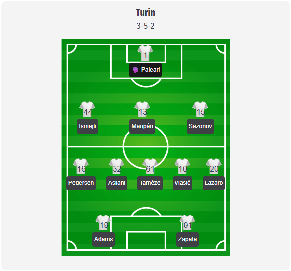 Η Τορίνο αναμένεται να διατηρήσει το γνωστό 3-5-2, με τον Παλεάρι στην εστία, πίσω από μια τριάδα αμυντικών με τους Ισμαϊλί, Μαριπάν και Σαζόνοφ, ενώ οι Πέντερσεν και Λαζάρο θα καλύψουν τις πτέρυγες. Στο κέντρο, ο Asllani θα αναλάβει τον ρόλο του οργανωτή, πλαισιωμένος από τον Tameze με την καλή του φυσική κατάσταση και τον Vlasic που βρίσκεται σε καλή φόρμα, ενώ ο Adams θα σχηματίσει την επιθετική γραμμή μαζί με τον Zapata. Πρόκειται μόνο για μια προβλεπόμενη και όχι επίσημη σύνθεση, επιπλέον ο Baroni πρέπει να συνεχίσει να παίζει χωρίς αρκετούς αμυντικούς, καθώς οι Coco και Masina συμμετέχουν στο Κύπελλο Αφρικής, ο Schuurs είναι εκτός λόγω χειρουργικής επέμβασης στο γόνατο και ο Savva εξακολουθεί να απουσιάζει λόγω προβλήματος στον επιγονατιδικό τένοντα, με αποτέλεσμα να μειώνεται το βάθος τόσο στην άμυνα όσο και στις εξωτερικές θέσεις.