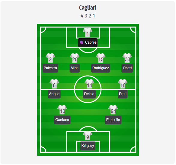 Και η Κάλιαρι αναμένεται να παραμείνει στην συνηθισμένη της διάταξη 4-3-2-1, με τον Caprile στην εστία και τετράδα στην άμυνα με τους Palestra, Mina, Rodríguez και Obert. Στο κέντρο του γηπέδου, οι Adopo, Deiola και Prati θα φροντίσουν για την ισορροπία, ενώ οι Gaetano και Esposito θα ενεργούν μεταξύ των γραμμών πίσω από τον Kilicsoy. Η στενή συνεργασία μεταξύ Gaetano και Kilicsoy εναντίον της Πίζας ήταν αξιοσημείωτη, οπότε δεν θα ήταν έκπληξη αν και πάλι αποτελέσουν τη ραχοκοκαλιά της επίθεσης. Αυτή η προβλεπόμενη, αλλά όχι ακόμη επιβεβαιωμένη σύνθεση, επηρεάζεται σε μεγάλο βαθμό από τις απουσίες, καθώς οι Zé Pedro και Felici παραμένουν εκτός δράσης για μεγάλο χρονικό διάστημα, ο Folorunsho δεν είναι διαθέσιμος μετά τον τραυματισμό του εναντίον της Πίζας και ο Belotti αναρρώνει ακόμη από ρήξη χιαστού συνδέσμου. Το Κύπελλο Αφρικής αποκλείει τους Liteta και Luvumbo από την επιλογή, γι’ αυτό οι εναλλακτικές λύσεις στην επίθεση θα πρέπει να προέλθουν κυρίως από τους Pavoletti και Borrelli, αν ο Pisacane θέλει να στηριχθεί σε ένα διαφορετικό προφίλ στην επίθεση.