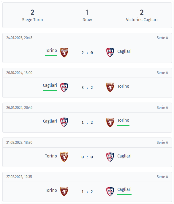 Στις τελευταίες πέντε αναμετρήσεις μεταξύ του Τορίνο και της Κάλιαρι, το ισοζύγιο είναι απολύτως ισορροπημένο, με κάθε ομάδα να έχει δύο νίκες, μια ισοπαλία και διαφορά τερμάτων 7:6 υπέρ του Τορίνο. Η σειρά διαρκεί από το 2022 έως τον Ιανουάριο του 2025 και κανένα από τα παιχνίδια δεν έληξε με σαφή ήττα. Αυτό υποδηλώνει μάλλον μια αναμέτρηση που θα κριθεί από μικρές διαφορές, παρά μια σαφή ψυχολογική υπεροχή της μιας ή της άλλης πλευράς. Αν εξετάσουμε μόνο τα εντός έδρας παιχνίδια της Τορίνο, η εικόνα έχει αλλάξει κάπως τελευταία, το 2022 η Κάλιαρι εξασφάλισε εδώ μια νίκη με 2:1, το 2023 οι ομάδες αλληλοεξουδετερώθηκαν με 0:0 και τον Ιανουάριο του 2025 η Τορίνο τελικά επικράτησε με 2:0, οπότε η πρόσφατη εξέλιξη σε αυτό το γήπεδο, μετά από μια αρχικά δύσκολη φάση, τείνει ελαφρώς υπέρ των γηπεδούχων. Τα αποτελέσματα της Κάλιαρι εντός έδρας εναντίον της Τορίνο είναι επίσης ανάμεικτα. Το 2024 κέρδισε ένα άγριο παιχνίδι με 3-2, αλλά την ίδια χρονιά έχασε εντός έδρας με 2-1. Συνολικά, σε τέσσερα από τα πέντε πιο πρόσφατα παιχνίδια σημειώθηκαν τουλάχιστον δύο γκολ, ενώ σε τέσσερα παιχνίδια δεν σημειώθηκαν περισσότερα από τρία γκολ. Η μόνη εξαίρεση από αυτό το εύρος ήταν το γκολάτο 3-2 το 2024. Επίσης, υπήρξε μια σειρά τριών αγώνων από το 2022 έως τις αρχές του 2024, όπου κάθε αγώνα έμεινε κάτω από 3,5 γκολ, με αποτελέσματα 2-1, 0-0 και 2-1. Η Τορίνο σκόραρε σε τέσσερις από τις πέντε αναμετρήσεις, η Κάλιαρι σε τρεις, ενώ η Κάλιαρι δέχτηκε γκολ σε τέσσερις αγώνες. Είναι ενδιαφέρον ότι η Τορίνο θα μπορούσε να μπει στο επόμενο κεφάλαιο αυτής της αναμέτρησης με λίγο μεγαλύτερη αυτοπεποίθηση στην επίθεση.