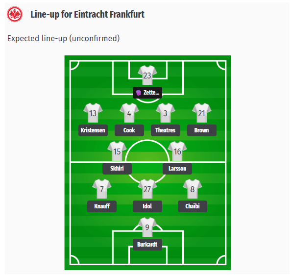 Ο προπονητής Dino Toppmöller αναμένεται να χρησιμοποιήσει το συνηθισμένο σύστημα 4-2-3-1. Στο τέρμα θα βρίσκεται ο Zetterer, ενώ την άμυνα θα σχηματίσουν οι Kristensen, Koch, Theate και Brown. Τη θέση του διπλού εξάρι στο αμυντικό κέντρο θα καλύψουν οι Skhiri και Larsson. Στο επιθετικό κέντρο θα αγωνιστεί ο Götze πίσω από τον Burkardt, πλαισιωμένος από τους Knauff και Chaïbi. Ο Burkardt παραμένει η μόνη αξιόπιστη επιλογή στην κορυφή της επίθεσης. Ο Can Uzun απουσιάζει λόγω μυϊκού τραυματισμού και η επιστροφή του αναμένεται στις αρχές Δεκεμβρίου. Τραυματίες είναι επίσης οι Oscar Højlund και Elias Baum. Στην επίθεση υπάρχουν αβεβαιότητες: ο Elye Wahi δεν βρίσκεται σε καλή φόρμα και ενδέχεται να αλλάξει ομάδα, ενώ και ο Batshuayi είχε πρόσφατα αδύναμες εμφανίσεις. Συνολικά, αυτό σημαίνει ότι η ομάδα διαθέτει ένα σχετικά μικρό ρόστερ για τις επερχόμενες αναμετρήσεις.