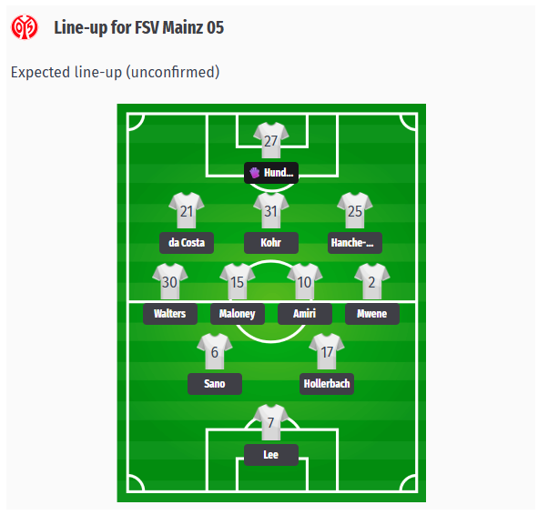 Η Μάιντς βρίσκεται στη 17η θέση της βαθμολογίας με πέντε βαθμούς και παλεύει να αποφύγει τον υποβιβασμό από τη Μπουντεσλίγκα. Στα τελευταία πέντε παιχνίδια του πρωταθλήματος δεν έχει σημειώσει καμία νίκη, με τέσσερις ήττες και μόνο ένα 1-1 εναντίον της Βρέμης. Σε αντίθεση με αυτό, η Μάιντς παρουσιάζεται δυνατή στην Conference League: εννέα βαθμοί σε τρία παιχνίδια του ομίλου, με τελευταία μια θεαματική νίκη 2-1 εναντίον της Φλωρεντίας χάρη στο γκολ του Lee Jae-sung στην παράταση. Τέτοιες επιτυχίες προσφέρουν θετική ενέργεια, όπως τόνισε ο αθλητικός διευθυντής Bungert. Ο προπονητής Bo Henriksen έκανε αλλαγές στην τακτική και δοκίμασε εναντίον της Βρέμης μια νέα επιθετική διάταξη με τον Hollerbach στη θέση του μέσου και τον Lee ως ψεύτικο εννιάρι, η οποία απέδωσε εναντίον της Φλωρεντίας. Ο Hollerbach έφτιαξε το γκολ της ισοφάρισης και σκόραρε ο ίδιος, ενώ ο Lee πέτυχε το γκολ της νίκης με ένα σέντρας. Αυτή η σύνθεση της αρχικής ενδεκάδας θα ξεκινήσει πιθανότατα και εναντίον της Φρανκφούρτης. Συνεχίζουν να απουσιάζουν οι Caci με τραυματισμό στο μηρό, Leitsch λόγω γρίπης και Dal με ρήξη χιαστού συνδέσμου. Ο Henriksen δεν μπόρεσε μέχρι στιγμής να εμπιστευτεί πλήρως τους εναλλακτικούς Sieb και Weiper. Από αθλητικής άποψης, η Μάιντς απέχει μόνο έναν βαθμό από τη Γκλάντμπαχ, ενώ η απόσταση από τη θέση του υποβιβασμού είναι επίσης μικρή, οπότε η κατάσταση είναι κρίσιμη, αλλά όχι απελπιστική.