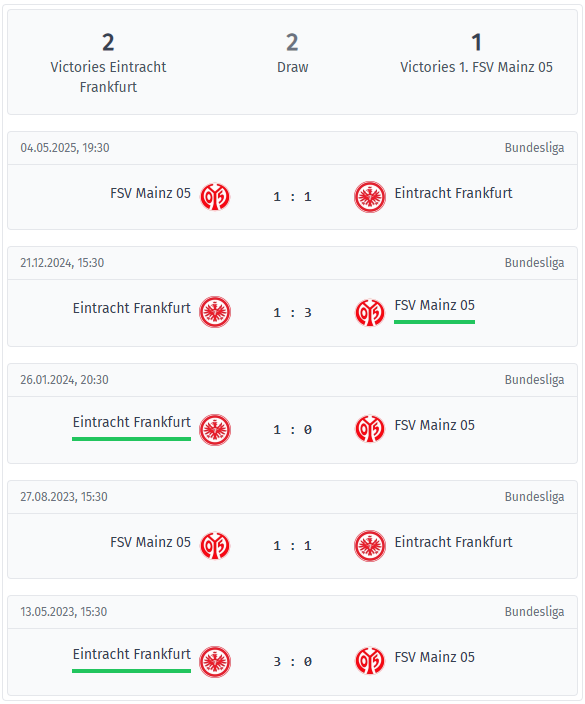 Στις τελευταίες πέντε αναμετρήσεις μεταξύ Φρανκφούρτης και Μάιντς, το ισοζύγιο ήταν ισορροπημένο, με δύο νίκες για τη Φρανκφούρτη, μία νίκη για τη Μάιντς και δύο ισοπαλίες. Και οι δύο ομάδες σκόραραν και στις πέντε αναμετρήσεις, οπότε κανένα παιχνίδι δεν έμεινε χωρίς γκολ. Είναι αξιοσημείωτη η κατανομή ανά ημίχρονο: η Φρανκφούρτη κυριάρχησε στο δεύτερο ημίχρονο σε τρεις συνεχόμενες αναμετρήσεις, ενώ η Μάιντς δέχτηκε τουλάχιστον ένα γκολ μετά το ημίχρονο στις τέσσερις τελευταίες αναμετρήσεις. Σε τέσσερις από τις πέντε τελευταίες αναμετρήσεις, στο δεύτερο ημίχρονο σημειώθηκαν το πολύ 1,5 γκολ, κάτι που υποδηλώνει συγκρατημένες τελικές φάσεις. Συνολικά, οκτώ από τα δέκα παιχνίδια που εξετάστηκαν έληξαν με περισσότερα από 1,5 γκολ, αλλά συχνά παρέμειναν κάτω από 3,5 γκολ. Το πιο πρόσφατο παιχνίδι τον Μάιο του 2025 έληξε 1-1 στη Μάιντς, ενώ προηγουμένως η Μάιντς κέρδισε εκπληκτικά με 3-1 στη Φρανκφούρτη τον Δεκέμβριο του 2024. Οι αναμετρήσεις είναι συνολικά ισορροπημένες, αλλά η Φρανκφούρτη έχει τα καλύτερα στατιστικά στο δεύτερο ημίχρονο. Ως εκ τούτου, οι προβλέψεις δείχνουν ένα παιχνίδι με λίγα ή μέτρια γκολ, με δύο έως τρία γκολ συνολικά.