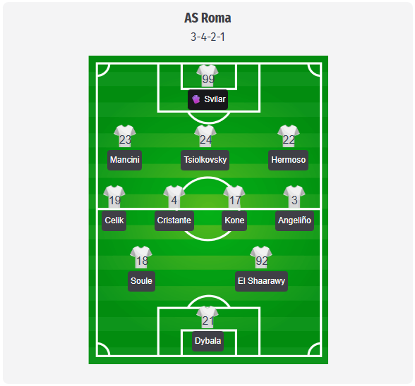 Είναι ενδιαφέρον ότι η AS Ρόμα υπό τον Gasperini θα παραμείνει στο γνωστό 3-4-2-1, με τον Svilar στο τέρμα πίσω από μια τριάδα αμυντικών με τους Mancini, Ziolkowski και Hermoso. Οι Çelik και Angeliño θα παίζουν ως ψηλά wingbacks για να προσφέρουν πλάτος και πίεση, κάτι που ανταποκρίνεται στην απαίτηση του προπονητή για περισσότερη επιθετικότητα, ενώ οι Cristante και Koné θα καλύπτουν το κέντρο. Μπροστά, οι Soulé και El Shaarawy θα μπορούν να κινούνται ελεύθερα μεταξύ των γραμμών γύρω από τον Dybala, ενώ οι Ferguson και Dovbyk θα είναι έτοιμοι ως εναλλακτικές επιλογές στον πάγκο. Η AS Ρόμα θα πρέπει να τα βγάλει πέρα και πάλι χωρίς τους Ndicka και El Aynaoui, που βρίσκονται με τις εθνικές τους ομάδες, ενώ θα λείπουν και οι Bove και Pellegrini, που παραμένουν τραυματίες. Ωστόσο, η βασική δομή αυτής της προβλεπόμενης ενδεκάδας αναμένεται να παραμείνει αμετάβλητη, με τον Mancini να συντονίζει την τριάδα της άμυνας και τον Cristante να παίζει δίπλα στον Koné στο κέντρο, ενώ οι Wesley, Bailey και Baldanzi φαίνονται περισσότερο ως επιλογές για να αλλάξουν το παιχνίδι από τον πάγκο.
