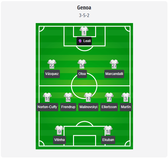 Λόγω των πρόσφατων αποφάσεων και παρά την ήττα στην παράταση από την Αταλάντα, αναμένεται ότι η Γένοβα υπό τον Ντε Ρόσι θα διατηρήσει το δοκιμασμένο 3-5-2. Στην προβλεπόμενη σύνθεσή μας, ο Λεάλι θα είναι στο τέρμα, μπροστά του μια τριάδα με τους Βάσκεζ, Οτόα και Μαρκαντάλι, ενώ οι Νόρτον-Κάφι και Μαρτίν θα προσφέρουν πλάτος ως πλάγιοι αμυντικοί. Στο μεσαίο χώρο θα αγωνιστούν οι Frendrup, Malinovskyi και Ellertsson, πίσω από το δυναμικό δίδυμο των Vitinha και Ekuban. Η πρόβλεψή μας λαμβάνει υπόψη τις απουσίες των Siegrist, Onana και Cuenca, οπότε οι επιλογές για αλλαγές στο τέρμα και στις πιο δυναμικές θέσεις του μεσαίου χώρου είναι περιορισμένες. Ο Frendrup, ο οποίος τις τελευταίες ημέρες συνδέθηκε με την AS Ρόμα, αναμένεται να ξεκινήσει και πάλι, ενώ ο Carboni, του οποίου η δανειοδότηση στη Γένοβα τελειώνει πρόωρα σύμφωνα με πληροφορίες, παραμένει μάλλον στο παρασκήνιο σε αυτή την πρόβλεψη και οι Stanciu, Cornet ή Messias μπορούν να δώσουν ώθηση από τον πάγκο.
