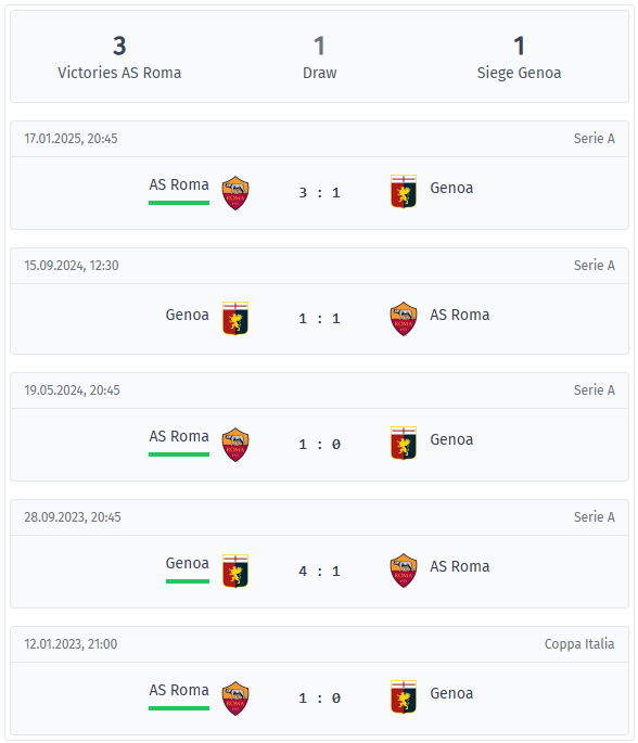 Στις τελευταίες πέντε αναμετρήσεις μεταξύ της AS Ρόμα και της Τζένοα, η AS Ρόμα έχει το ελαφρώς καλύτερο ρεκόρ με τρεις νίκες, ενώ η Τζένοα έχει μία νίκη και μία ισοπαλία, με το συνολικό σκορ σε αυτό το διάστημα να είναι 7-6 υπέρ της AS Ρόμα. Είναι σημαντικό ότι η AS Ρόμα μπαίνει σε αυτό το ντέρμπι με μια σειρά τριών αγώνων χωρίς ήττα, με δύο νίκες και μία ισοπαλία. Τον Ιανουάριο του 2025, η AS Ρόμα κέρδισε 3-1 στο γήπεδό της, επιβεβαιώνοντας τη νίκη 1-0 στο γήπεδό της το 2024 και ακολουθώντας την ισοπαλία 1-1 εκτός έδρας την ίδια χρονιά. Η μόνη νίκη της Τζένοα σε αυτό το διάστημα χρονολογείται από το 2023 με μια σαφή νίκη 4-1 εντός έδρας, ενώ η σειρά ξεκίνησε με τη νίκη της AS Ρόμα με 1-0 στο Coppa Italia 2023. Η AS Ρόμα σκόραρε σε κάθε ένα από αυτά τα πέντε παιχνίδια, η Γένοβα δέχτηκε γκολ και στα πέντε παιχνίδια, και σε τέσσερα παιχνίδια η AS Ρόμα σκόραρε ακριβώς ένα γκολ, γεγονός που υπογραμμίζει πόσο συχνά οι διαφορές ήταν μικρές. Η εξαίρεση είναι το παιχνίδι του Ιανουαρίου 2025, στο οποίο η AS Ρόμα σκόραρε τρία γκολ. Είναι επίσης αξιοσημείωτο ότι τα δεύτερα ημίχρονα δεν έληξαν ποτέ ισόπαλα και δεν είχαν ποτέ περισσότερα από δύο γκολ. Το πλεονέκτημα της έδρας έπαιξε σαφώς σημαντικό ρόλο, καθώς η AS Ρόμα είναι αήττητη στην έδρα της σε αυτό το διάστημα με τρεις νίκες, δύο στο πρωτάθλημα και μία στο κύπελλο, και μόνο ένα γκολ που δέχτηκε, ενώ εκτός έδρας πήρε μόνο έναν βαθμό με την ισοπαλία το 2024 και υπέστη την ήττα με 4-1 το 2023, η οποία παραμορφώνει κάπως τη διαφορά τερμάτων. Συνολικά, πολλά στοιχεία δείχνουν ότι η AS Ρόμα συνήθως βρίσκει τον δρόμο προς το γκολ εναντίον της Γένοβας, αλλά τα παιχνίδια τείνουν να παραμένουν σχετικά ισορροπημένα και, ενδιαφέροντα, το ψυχολογικό βάρος των τριών θετικών αποτελεσμάτων στη σειρά θα μπορούσε να επηρεάσει τον τρόπο με τον οποίο η Γένοβα θα αντιμετωπίσει την επόμενη αναμέτρηση, πιθανώς με ένα πιο προσεκτικό σχέδιο, προκειμένου να παραμείνει επιτέλους χωρίς να δεχτεί γκολ σε αυτό το ντέρμπι.