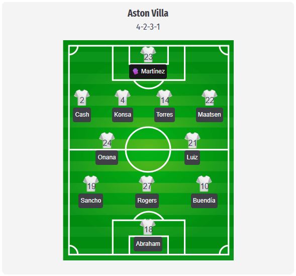 Ο Έμερι θα παραμείνει πιθανώς στο γνωστό 4-2-3-1, με τον Μαρτίνεζ στο τέρμα και τους Κας, Κόνσα, Τόρες και Ματσένς στην τετράδα της άμυνας. Η πρόβλεψη βλέπει τους Ονάνα και Λουίζ ως διπλό εξάρι, κάτι που δίνει στον Βίλα τη βάση για να τρέξει νωρίς και να συνδυάσει το κέντρο του γηπέδου.
