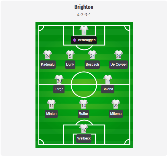 Η Μπράιτον αναμένεται να αγωνιστεί με 4-2-3-1, με τον Verbruggen πίσω από μια τετράδα με τους Kadıoğlu, Dunk, Boscagli και De Cuyper. Στο διπλό εξάρι, πολλά μιλούν υπέρ των Groß και Baleba, που δίνουν στους Seagulls έναν ήρεμο οργανωτή και έναν παίκτη που κερδίζει τις μπάλες. Μπροστά τους, οι Minteh και Mitoma θα πρέπει να φέρουν κίνηση με τις άμεσες κινήσεις τους δεξιά και αριστερά του Rutter. Στην κορυφή, ο Welbeck φαίνεται να είναι ο σαφής φαβορί για την αρχική ενδεκάδα. Αυτή η βασική διάταξη μπορεί να οφείλεται και σε τραυματισμούς: οι van Hecke και Webster εξακολουθούν να απουσιάζουν από την άμυνα, ενώ οι Wieffer, Ayari, March και Tzimas δεν είναι ακόμα διαθέσιμοι, και ο Gómez επίσης δεν θα είναι διαθέσιμος. Αν ο Hürzeler θέλει φρέσκα πόδια στο κέντρο, ο Hinshelwood ή ο Milner θα μπορούσαν να υποστηρίξουν τους Groß και Baleba. Ο O’Riley είναι επίσης μια προφανής επιλογή για να φέρει περισσότερη δημιουργικότητα στο τελευταίο τρίτο από τον πάγκο.