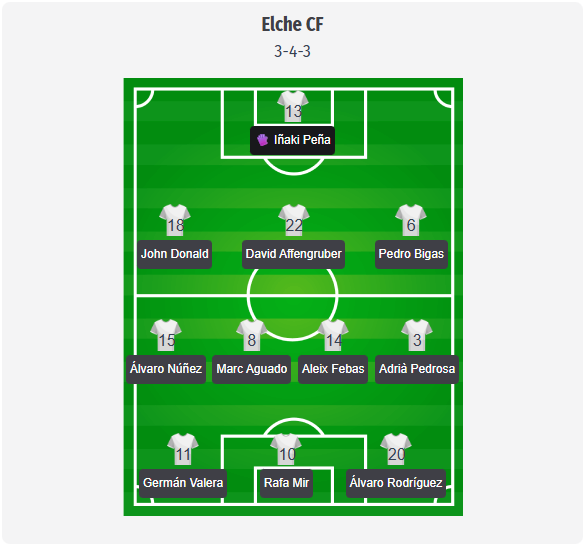 Η Έλτσε αναμένεται να αγωνιστεί με τον Έντερ Σαράμπια σε ένα σύστημα 3-4-3, τουλάχιστον σύμφωνα με την προβλεπόμενη ενδεκάδα μας, με τον Ινάκι Πένα στο τέρμα μπροστά από μια τριάδα αμυντικών με τους Ντόναλντ, Αφενγκρούμπερ και Μπίγκας. Ο Núñez και ο Pedrosa θα παίζουν ως εξτρέμ, ο Aguado και ο Febas θα αποτελούν το κεντρικό δίδυμο της μεσαίας γραμμής, ενώ ο Valera και ο Álvaro Rodríguez θα υποστηρίζουν τον Rafa Mir σε μια ευέλικτη επιθετική γραμμή. Αυτή η σύνθεση παραμένει μια πιθανότητα, καθώς ο Héctor Fort δεν είναι διαθέσιμος μετά από μια εγχείρηση στον ώμο, ένας αμυντικός που είχε αποκτήσει σημασία υπό τον Sarabia και η απουσία του ανοίγει εκείνη την πλευρά για εναλλακτικές λύσεις. Στην πρόβλεψή μας, ο Núñez ξεκινά ως εξωτερικός, ενώ στον πάγκο βρίσκονται αμυντικοί όπως ο Chust και ο Diaby, καθώς και επιθετικές επιλογές όπως ο Diangana ή ο André Silva, κάτι που θα επέτρεπε στον Sarabia να προσαρμόσει μια ομάδα που έχει ήδη χαρακτηριστεί ως προσανατολισμένη στην κατοχή της μπάλας κατά τη διάρκεια του αγώνα.