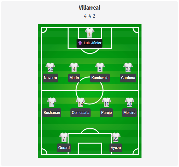 Η Βιγιαρεάλ υπό τον Μαρσελίνο αναμένεται να παραμείνει στο συνηθισμένο 4-4-2, με πιθανή αρχική ενδεκάδα τον Júnior στο τέρμα, πίσω από μια αμυντική γραμμή με τους Navarro, Marín, Kambwala και Cardona. Στο κέντρο, οι Buchanan και Moleiro θα προσφέρουν πλάτος, ενώ οι Comesaña και Parejo θα καλύπτουν το κέντρο, και μπροστά ο Moreno θα ξεκινήσει μαζί με τον Pérez. Αυτή η σύνθεση είναι πρόβλεψη και δεν έχει επιβεβαιωθεί από τον σύλλογο. Αμυντικά, έχουν ελλείψεις στην κεντρική άμυνα, καθώς οι Costa, Foyth και Mouriño είναι όλοι τραυματίες, οπότε ο Μαρίν και ο Καμπουάλα θα πρέπει να συνεχίσουν ως ζευγάρι κεντρικών αμυντικών. Στο μεσαίο χώρο, οι Γκεγιέ και Παρτέι εξακολουθούν να απουσιάζουν, γεγονός που αυξάνει το βάρος για τους Κομεσάνα και Παρέχο. Επιπλέον, απουσιάζουν οι Ιλιάς και Καμπάνες, ενώ από τον πάγκο οι Βέιγκα, Πεδράσα, Σόλομον, Πεπέ ή Μικαουτάτζε θα μπορούσαν να αλλάξουν το παιχνίδι αν χρειαστεί.