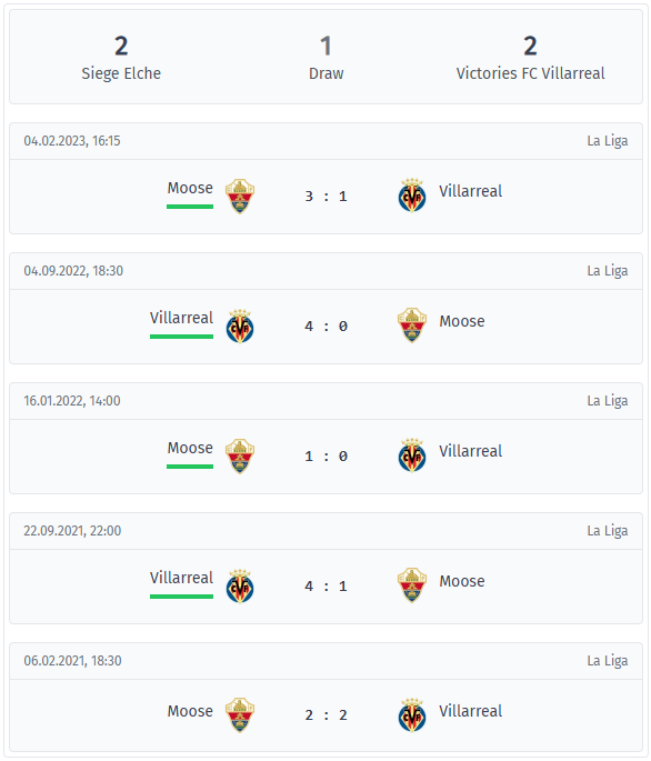 Elche CF – Villarreal Άμεση σύγκριση & στατιστικά