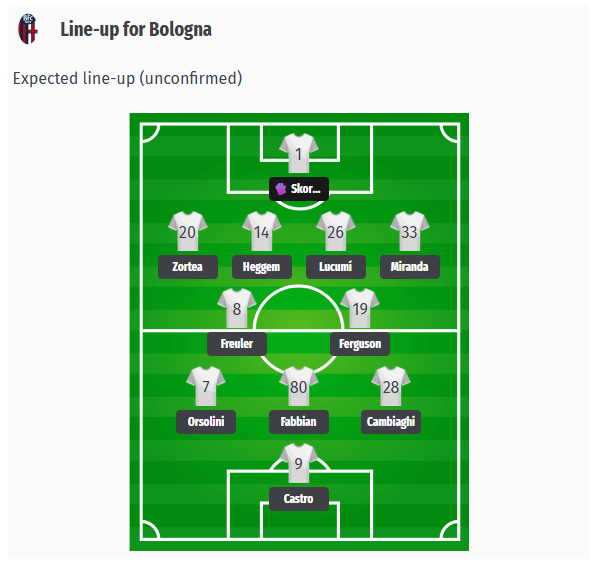 Ο Vincenzo Italiano αναμένεται να παρατάξει τη Μπολόνια σε σχηματισμό 4-2-3-1. Στο τέρμα θα βρίσκεται ο Skorupski, ενώ την τετράδα της άμυνας θα σχηματίσουν πιθανότατα ο Zortea στα δεξιά, οι Heggem και Lucumí στο κέντρο και ο Miranda στα αριστερά.