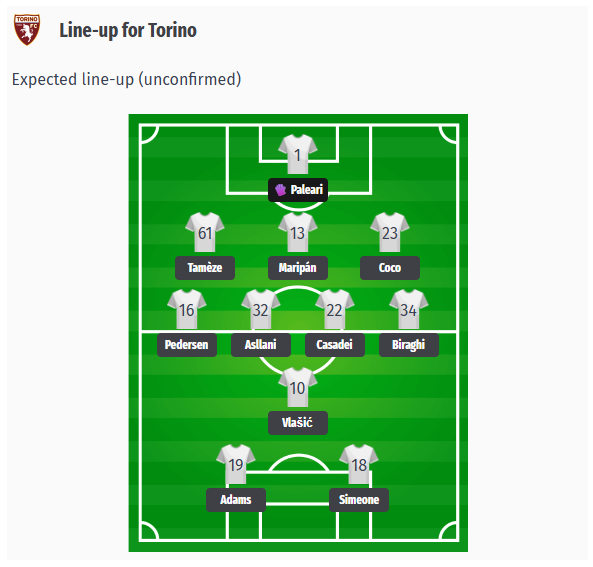 Η τριάδα της άμυνας αναμένεται να αποτελείται από τους Tamèze, Maripán και Coco. Στις πτέρυγες θα αγωνιστούν ο Pedersen στα δεξιά και ο Biraghi στα αριστερά. Στο κεντρικό μέσο, οι Asllani και Casadei θα φροντίσουν για τη σταθερότητα, ενώ ο Vlašić θα αγωνιστεί ως επιθετικός μέσος πίσω από το επιθετικό δίδυμο Adams και Simeone.