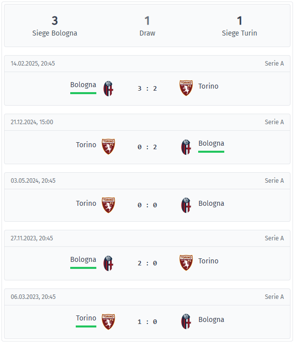 Και οι δύο ομάδες δείχνουν υψηλή αμυντική πειθαρχία στο πρώτο ημίχρονο σε αυτές τις αναμετρήσεις. Η Μπολόνια έχει κερδίσει το πλεονέκτημα στο πρόσφατο παρελθόν, ενώ η Τορίνο περιμένει μια νέα νίκη από το 1-0 το 2023.