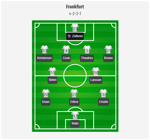 Our predicted Eintracht lineup is likely to remain a 4-2-3-1 under Toppmöller for this game. Zetterer should start in goal again, in line with the coach’s recent comments, in front of a back four of Kristensen, Koch, Theate, and Brown. Skhiri and Larsson are expected to anchor the midfield, covering the center and allowing the fullbacks to join in the attack when spaces open up. Further forward, we expect Doan on the right and Chaïbi on the left, with Götze operating centrally as a link-up player behind Wahi. With Burkardt and Batshuayi both out injured, Wahi is our predicted lone striker, while Ngankam is considered the first option off the bench. Tactically, this would correspond to Eintracht’s usual system, compact without the ball and mobile between the lines.