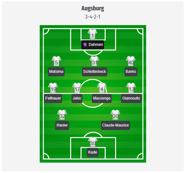 Under Baum, FC Augsburg are likely to stick with a 3-4-2-1 formation, with Dahmen in goal behind a back three of Matsima, Schlotterbeck, and Banks. Fellhauer and Giannoulis are likely to operate as aggressive wingbacks, while Jakic and Massengo form a combative double pivot. Rieder and Claude-Maurice are planned as free tens behind Kade, who could once again take the lead. In view of Gouweleeuw’s ligament injury, the experienced organizer is still out, so Schlotterbeck will probably take on more responsibility in the central structure. It is also possible that call-ups for the Africa Cup of Nations will thin out the attacking rotation, as Saad, Gharbi, and Essende are with their national teams. In this scenario, our predicted bench relies on Maier, Rexhbecaj, and Pedersen to change the pace.