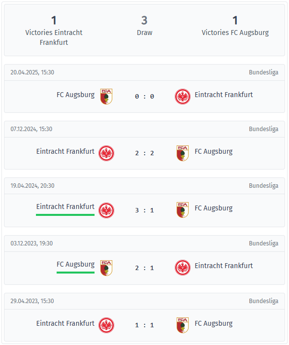 In the last five Bundesliga matches between Eintracht Frankfurt and FC Augsburg, the record is completely even, with one win each and three draws. The series runs from 2023 to April 2025, and no team has managed to win two games in a row during this period. The overall goal difference is slightly in Frankfurt’s favor, with seven goals scored and six conceded, which once again underlines the balance of this pairing. To put this into context, Frankfurt’s only win during this period came at home in 2024 with a 3-1 victory, while Augsburg’s only win came at home in 2023 with a 2-1 victory. In the three encounters in Frankfurt, the hosts remained undefeated with one win and two draws, meaning that Augsburg failed to win any of these five away games. Draws are a constant theme, with three in five encounters, and both of the most recent duels ended in draws: in December 2024, there was a 2-2 draw in Frankfurt, then April 2025 brought a goalless 0-0 draw in Augsburg. Interestingly, in all five games, there were fewer than 1.5 goals in the first half, so the matches usually started cautiously and tended to liven up after the break. In four of the five games, both teams scored and the match ended with at least two goals, with only the 0-0 draw in April 2025 breaking this pattern, which illustrates how rare it is for the defenses to keep a clean sheet in this duel and how often marginal details rather than clear superiority decide the outcome.