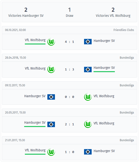 Ο απολογισμός των τελευταίων πέντε αναμετρήσεων είναι ισορροπημένος: δύο νίκες για το Αμβούργο και δύο για τη Βόλφσμπουργκ, καθώς και μία ισοπαλία. Η τελευταία αναμέτρηση είναι παλιά, τον Οκτώβριο του 2021, όταν η Βόλφσμπουργκ κέρδισε με 4-1 σε ένα φιλικό παιχνίδι.