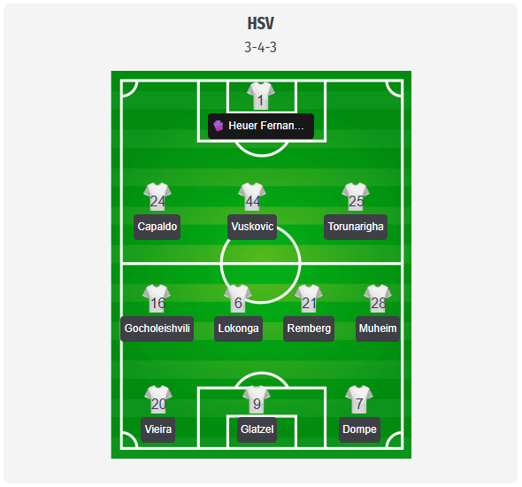 Ο προπονητής Merlin Polzin θα μπορούσε να βασιστεί και πάλι σε ένα σύστημα 3-4-3. Στην τριάδα της άμυνας, ο Vuskovic αναμένεται να παίξει μεταξύ των Capaldo και Torunarigha, με τον τερματοφύλακα Heuer Fernandes να βρίσκεται μπροστά τους. Στα πλάγια, οι Gocholeishvili και Muheim θα αναλάβουν να ανοίξουν το παιχνίδι, ενώ στο κεντρικό μέσο, οι Lokonga και Remberg θα κλείσουν τους χώρους και θα δώσουν ώθηση στην ανάπτυξη του παιχνιδιού. Στην επίθεση, το τρίο Vieira, Glatzel και Dompé αναμένεται να ασκήσει πίεση. Συνεχίζουν να λείπουν σημαντικοί αμυντικοί, ο Elfadli είναι εκτός λόγω τραυματισμού στους προσαγωγούς, ο Omari είναι εκτός λόγω ρήξης του εξωτερικού συνδέσμου, ενώ ο Poulsen λείπει από την επίθεση λόγω ρήξης μυϊκής ίνας. Η παραπάνω σύνθεση αποτελεί πρόβλεψη, η τελική σύνθεση της ομάδας θα ανακοινωθεί όπως συνήθως λίγο πριν την έναρξη του αγώνα.