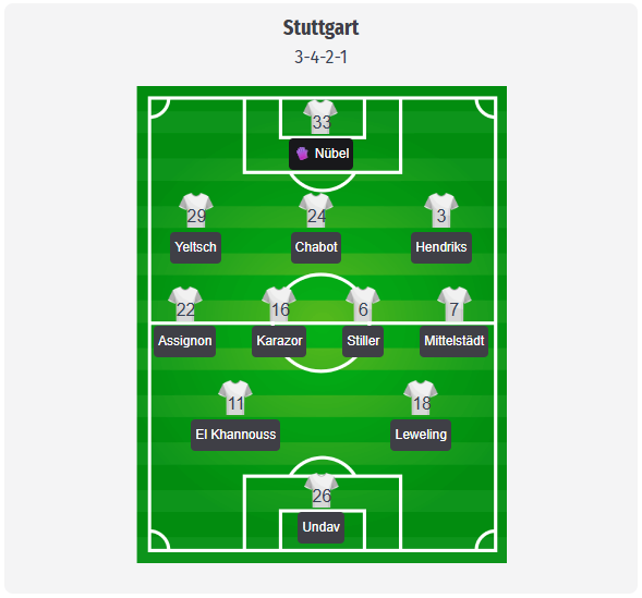 Ο Sebastian Hoeneß αναμένεται να χρησιμοποιήσει και πάλι το σύστημα 3-4-2-1. Στο τέρμα θα βρίσκεται ο Nübel, μπροστά του θα σχηματίσουν την τριάδα Jeltsch, Chabot και Hendriks. Στις πτέρυγες θα αγωνιστούν οι Assignon και Mittelstädt, στο κεντρικό μέσο αναμένεται το δίδυμο Karazor και Stiller. Στην επίθεση θα αγωνιστούν οι El Khannouss και Leweling ως επιθετικοί μέσοι, ενώ στην κορυφή θα αναλάβει και πάλι ο Undav μετά το χατ-τρικ του στο Ντόρτμουντ. Αξίζει να σημειωθεί η μεγάλη λίστα των απουσιών στην Europa League, καθώς οι Demirovic, Silas, Diehl, Stergiou, Stenzel και άλλοι παίκτες δεν είναι διαθέσιμοι λόγω έλλειψης αγωνιστικής άδειας, ενώ ο Tomás είναι τραυματίας. Αυτές οι περιορισμοί περιορίζουν αισθητά τις επιλογές του Hoeneß, γι’ αυτό και η αρχική ενδεκάδα αναμένεται να είναι παρόμοια με αυτή του 4-0 επί της Go Ahead Eagles.