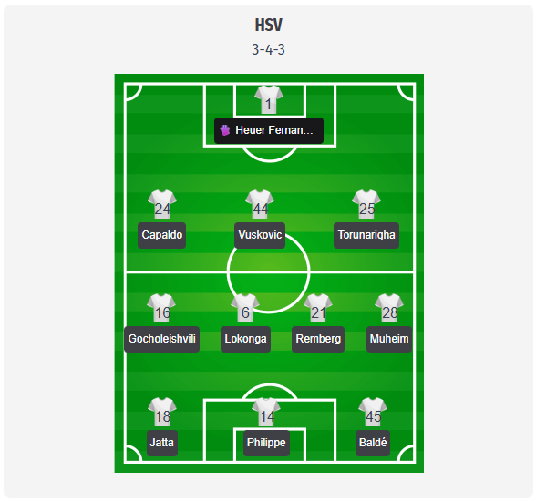 Είναι ενδιαφέρον ότι τίποτα δεν έχει επιβεβαιωθεί οριστικά, αλλά το Αμβούργο αναμένεται να διατηρήσει την προβλεπόμενη διάταξη 3-4-3, με τον Heuer Fernandes στο τέρμα πίσω από μια τριάδα αμυντικών με τους Capaldo, Vuskovic και Torunarigha. Οι Gocholeishvili και Muheim αναμένεται να προσφέρουν πλάτος ως wingbacks, ενώ ο Lokonga και ο επιστρέφοντας Remberg θα καλύπτουν το κεντρικό μέσο. Στην επίθεση, ο Jatta και ο Philippe Baldé θα πρέπει να υποστηρίξουν μια ευέλικτη γραμμή επίθεσης. Ωστόσο, αυτή η σύνθεση παραμένει μια πρόβλεψη, καθώς ο Polzin στερείται αρκετών σημαντικών επιθετικών. Οι Poulsen, Glatzel, Dompé, Omari και Røssing-Lelesiit είναι όλοι εκτός, γεγονός που αυξάνει τις πιθανότητες για τους Jatta, Philippe, Baldé και πιθανώς Königsdörffer στις πρώτες θέσεις. Ο Vieira και ο Ramos παραμένουν αμφίβολοι μετά από ασθένεια και, αν συμπεριληφθούν στην αποστολή, θα μπουν πιθανότατα μόνο ως αλλαγή.