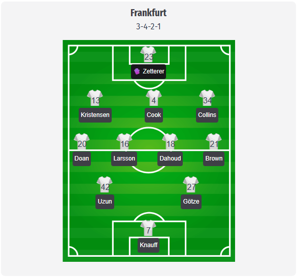 Η Eintracht αναμένεται να παραμείνει στην οικεία βασική διάταξη 3-4-2-1. Η προβλεπόμενη σύνθεσή μας περιλαμβάνει τον Zetterer στο τέρμα και τους Kristensen, Koch και Collins στην τριάδα της άμυνας μπροστά του. Οι Doan και Brown θα καλύψουν τις πτέρυγες, οι Larsson και Dahoud το κεντρικό μέσο, ενώ οι Uzun και Götze θα ενεργούν πίσω από τον Knauff. Αυτή η δομή προσφέρει στον Dino Toppmöller μεγάλη αντοχή στην πίεση στο κέντρο και ταχύτητα στην αντεπίθεση. Σημαντικές απουσίες χαρακτηρίζουν αυτή την προβλεπόμενη ενδεκάδα, καθώς οι Skhiri και Chaibi θα απουσιάσουν λόγω του Κυπέλλου Αφρικής και οι Burkardt και Batshuayi είναι τραυματίες. Ο Theate είναι τιμωρημένος μετά την πέμπτη κίτρινη κάρτα του, ενώ ο Koch είχε προβλήματα με τους γάμπες του στον αγώνα με την Άουγκσμπουργκ, οπότε ο Amenda μπορεί να χρειαστεί σε περίπτωση που υπάρξει κάποιο πρόβλημα. Στην επίθεση, ο Knauff ξεκινάει στο κέντρο, με τους Wahi και Ngankam να είναι οι πιο σημαντικές επιλογές από τον πάγκο, και συνολικά αυτό παραμένει μια πρόβλεψη.